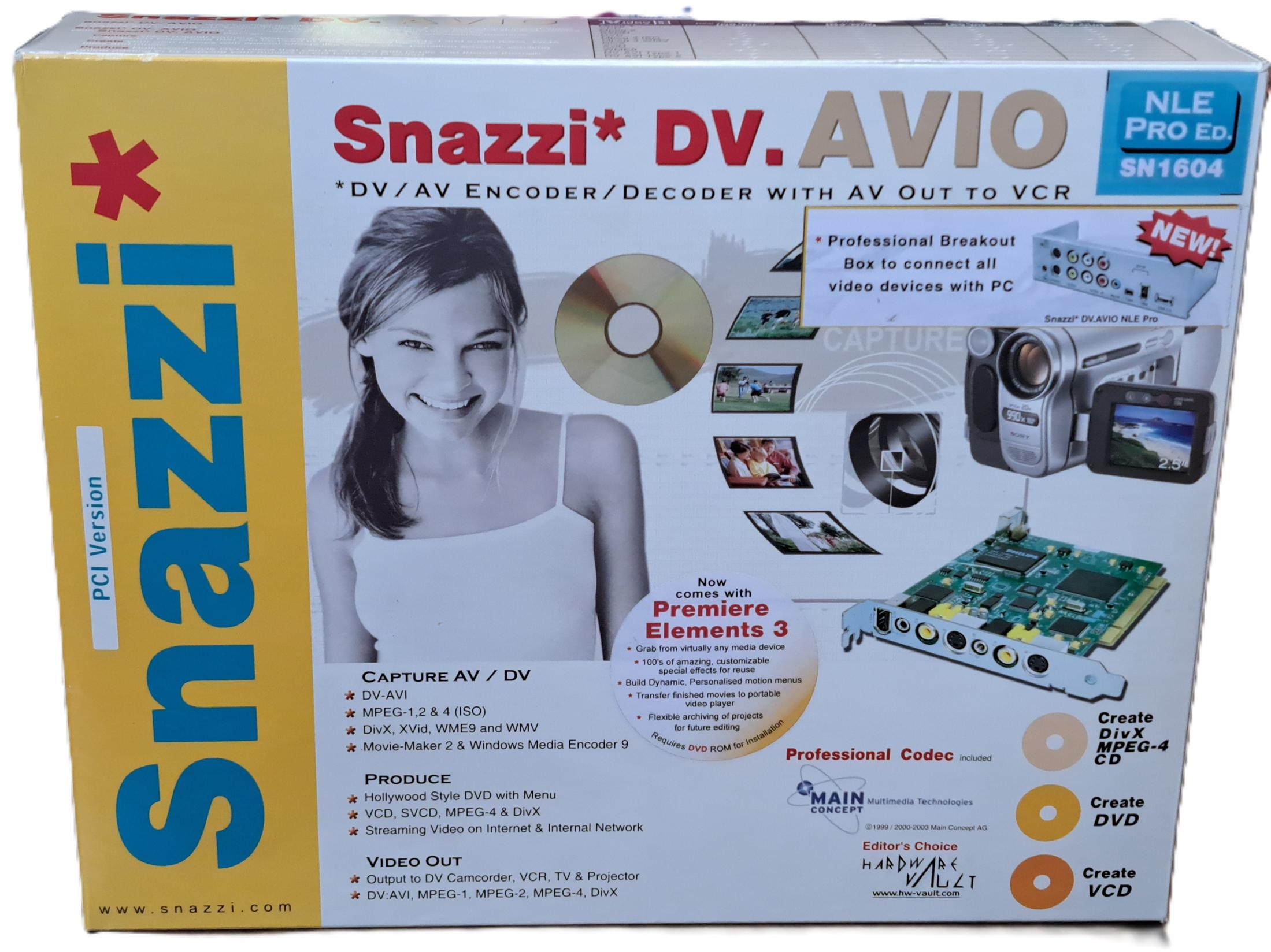 Snazzi* DV.AVIO EVO EDITION * Encode from AV & DV into DV-AVI, MPEG-1/2/4, WMV and DivX * Create full range of DVD SVCD VCD MPEG-4 and DivX CD * Create frame accurate video and stunning Titling and Effects for Trade applications * Output through DV and AV to DV Camcorder, VCR, TV, Plasma and Projector * Includes Breakout Box! Firewire In/Out, Composite Analog Video In/Out, S-Video In/Out, Analog Audio In/Out. * Similar PCI card and Breakout Box as SN1602, SN1615 and SN1620. But does not have firmware to support Adobe real time plugin. |